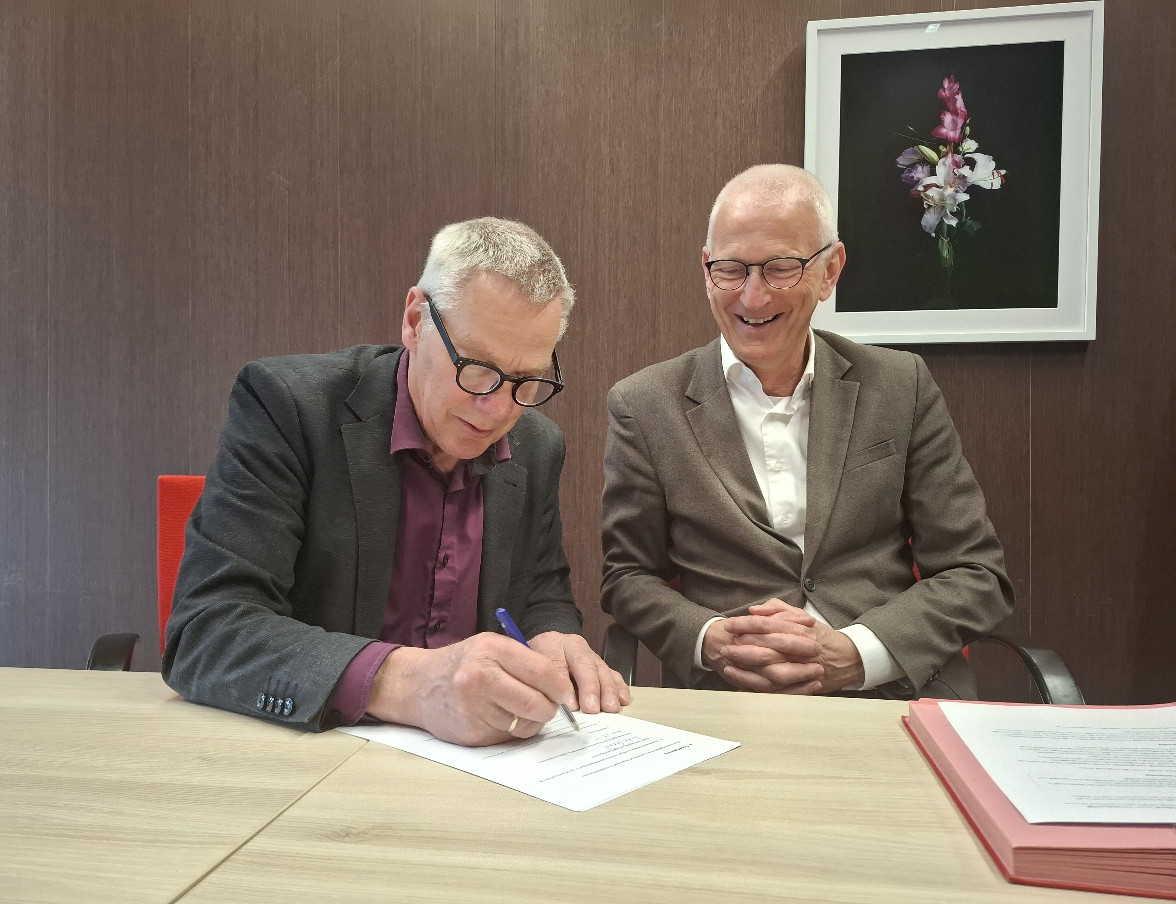 Hoogheemraad Bert de Groot van Hoogheemraadschap De Stichtse Rijnlanden (links) en directeur Hugo Jungen (rechts) van Omgevingsdienst Utrecht zetten hun handtekening onder de intentieovereenkomst.